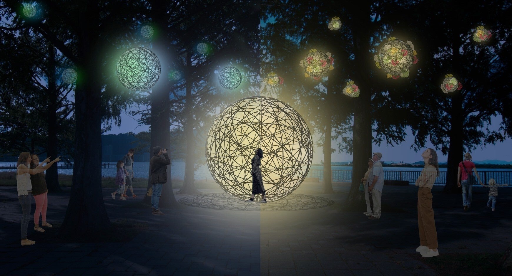 灯りは、滋賀県内で活動するアーティストや成安造形大学の学生ともコラボレーションし、夜だけでなく昼間も写真を撮りたくなるような、フォトジェニック空間を作り出します。